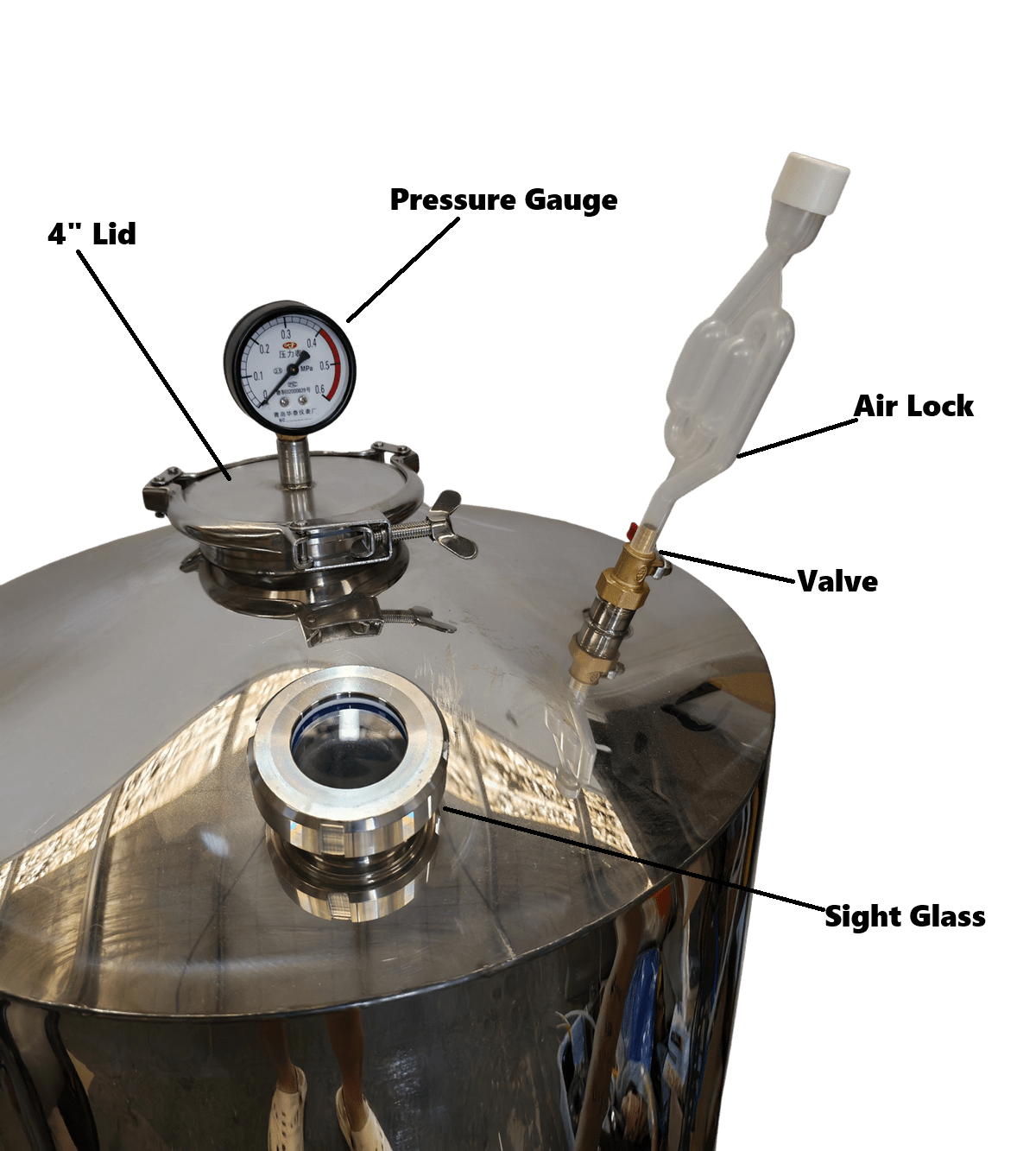 It has an 4″ Tri-clover lid with pressure gauge and a gas relief valve with airlock for fermentation.