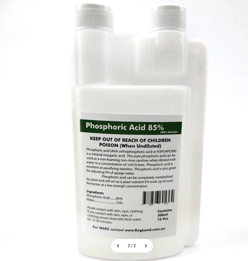 Phosphoric acid (AKA orthophosphoric acid or H3PO4) is a mineral inorganic acid that can be used as a non-foaming/non-rinse sanitiser when diluted to water to a concentration of 1mL/2L.