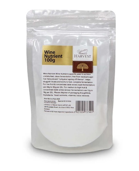 Wine Nutrient supports the yeast to achieve an undisturbed, clean fermentation, free from residual sugar. Can help prevent “”””untypical ageing off-flavour””””. Helps sluggish musts and worts to fast and complete fermentation. For low fruit & concentrate table wines (rapid fermentation) use 24g to 30g per 23L